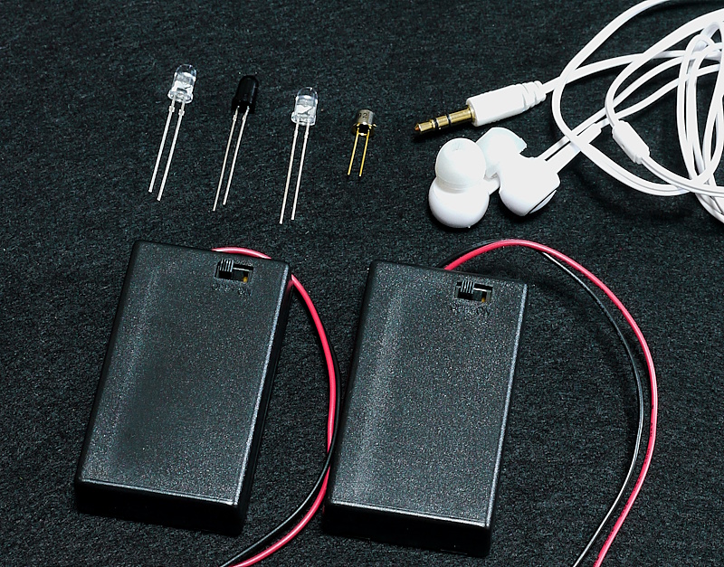 ・ 赤色LED(OS5RKA5111A)・ 赤外線LED(940nm:OSI5FU5111C-40) ・ 可視光フォトトランジスタ(3DU5C) ・ 赤外線フォトトランジスタ(L-51ROPT1D1) ・ 電池ボックス(単四×3個用、スイッチ付)×2個 ※ 電池は付属しません。 ・ イヤフォン(ステレオ、ミニジャック付) ・ 取扱説明書 頒布価格
