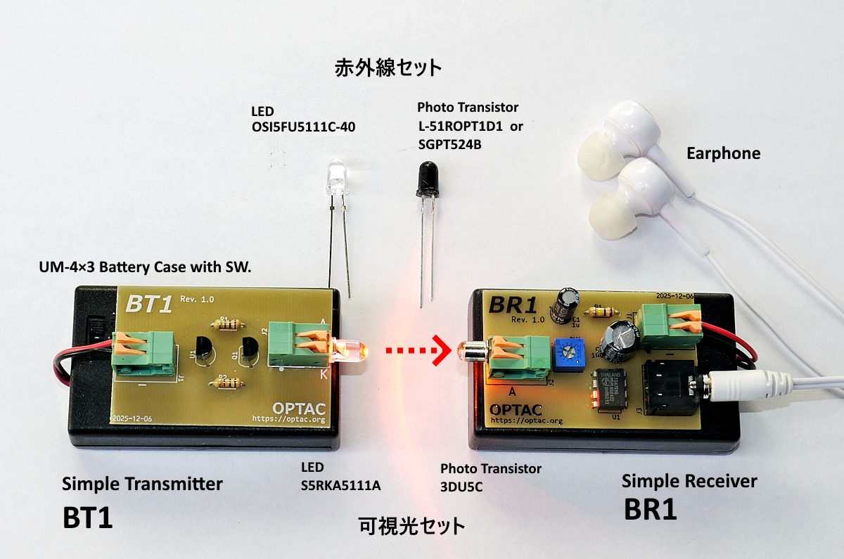 2026/3/15 ミニ通信セットの頒布を開始しました。ハンダ付けの必要のない完成基板2枚、計4種類のLEDとフォトトランジスタ、電池ボックス、イヤフォンなどがセットになっており、LED光空間通信の実験がすぐに行えます。送信部はオルゴールICをつかった簡易型で、単独の光ビーコン装置としても活用できます。