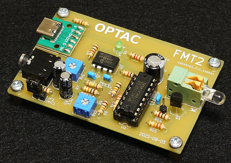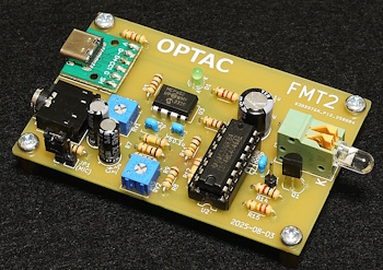 フォトダイオードとしては、QSD2030(onsemi)が付属します。FMT2との組み合わせにより、基板単体でも数メートル以上の通信が可能です。光学機構の工夫によりさらにDX通信にチャレンジしてください。