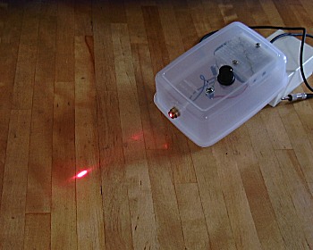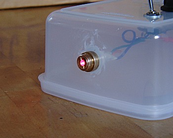 (A) 発光ダイオードの取り付け レーザーの発光ダイオードは、パーツとしては入手が比較的困難です。今回は、ゲームセンターにある「UFOキャッチャー」の戦利品から発光部を取り出しました。 3.6V供給、保護抵抗75Ωの回路が入っていましたので、LED送信機にそのまま移植しました。可変抵抗器はもう少し値の低いものが良いでしょう。 輝度は十分過ぎるぐらいです。レンズのフォーカス調整ができるようになっていますが、前後位置を追い込んでいくと200m先の建物の壁にくっきりと小さな円を描くことができました。直接目に光が入らないように注意してください。 |