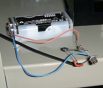 《送信部》 通常のLEDは1.7V前後で最高輝度に達します。乾電池2個(3V)に直接LEDをつけると、流が流れすぎてLEDがあの世に行ってしまいます。LEDと直列に100Ω程度の保護抵抗をいれ、電流が流れすぎないようにします。 またLEDに明るさの振幅変調をかける場合に、無信号時に「適当」な明るさで光るように、さらに直列にボリュームを入れています。 低周波信号は、オーディオのアンプやラジセからもらってきますが、直流成分がそれらに流れていかないように、直流カットのコンデンサをいれます。部品3点の追加で送信機は完成です! |