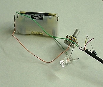 《発光ダイオード》 熱が出ないで長持ちするランプはできないか・・・これは人類の長年の夢でした。それを可能力にしてくれたのが発光ダイオード(LED)です。 豆電球に置き換えられるほど明るいLEDも出てきていますが、明るさだけ言うならば依然としてフィラメント型の方が優れています。 LEDのすばらしいところはその反応の速さです。非常に高い周波数での変調が可能ですので、ひとつの光に複数の信号を乗っけてしまうことも可能です。(多重伝送) 今回の製作物では、アナログ変調といって、単に電気信号を光量の大小に置き換えているに過ぎません。 |