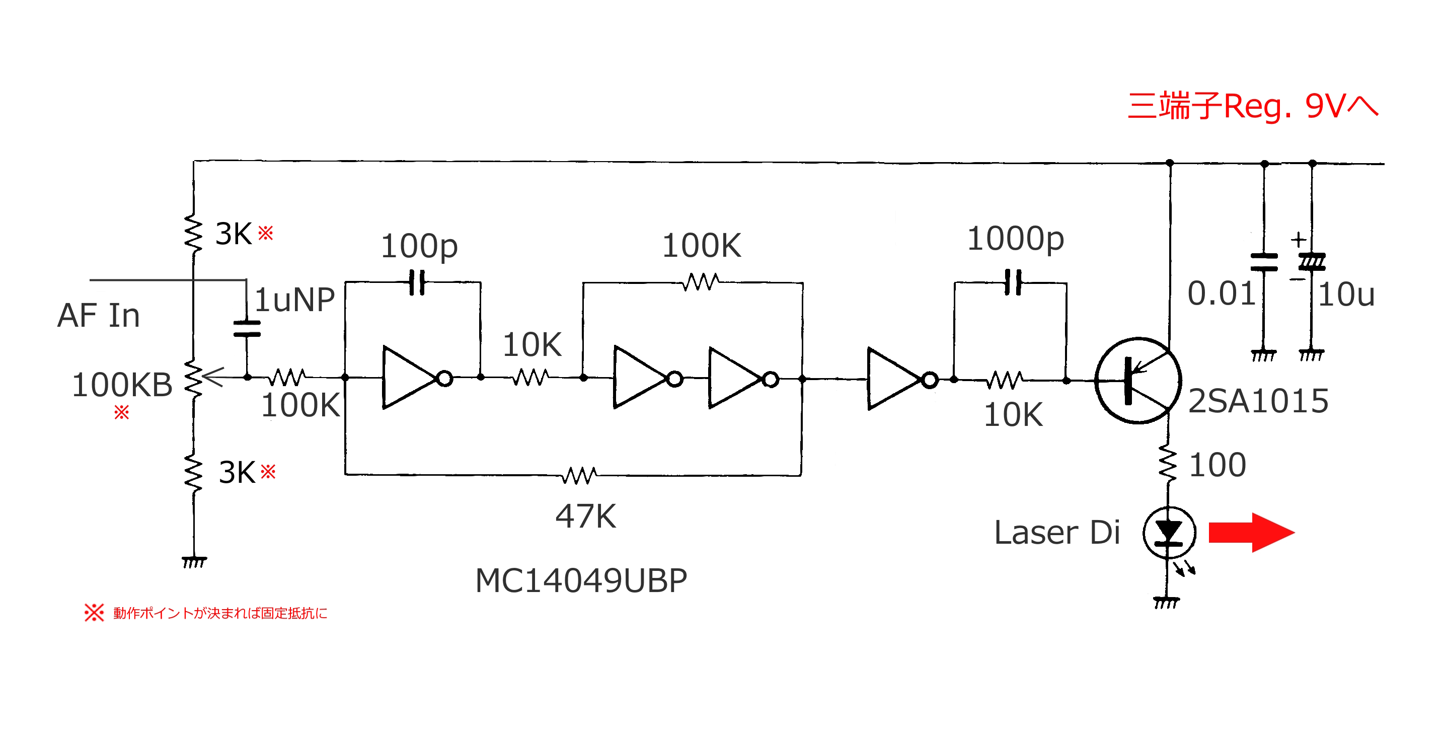 文章を交えた解説は次の Facebook 記事をお読みください。 赤色LaserLEDとC-MOSインバーター発振回路を使ったPFM光送信機 ![]() |