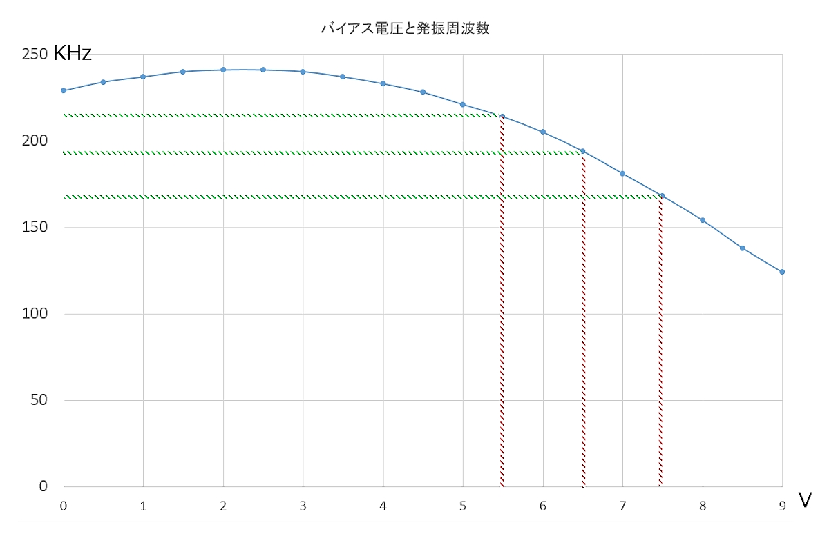 バイアス電圧と発振周波数の相関、および入力信号による周波数偏移の幅を示すグラフ