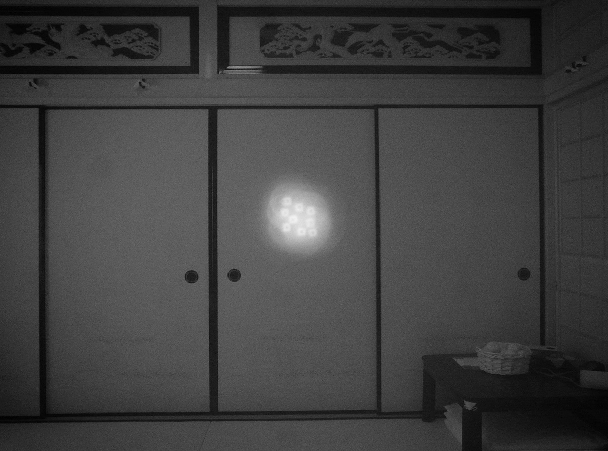 木製大枠の裏面に貼り付けDCで発光させてみる デジカメで見ると薄っすらと発光状態がわかる